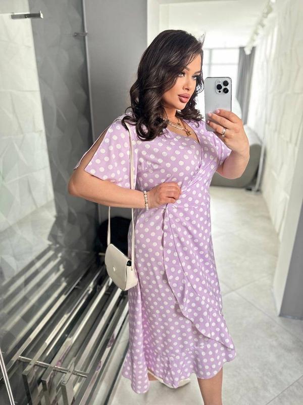 Неймовірно стильне і гарне плаття з легкого софта (розтяжності немає). Сукня з ефектом запаху, фіксується на завʼязку всередині і пояс зовні, за рахунок чого обхват грудей і талії можна регулювати. Рукав виконаний у формі «крильця». По низу спідниці декоровано воланом. Йде з біркою НОВА! Розмір: 48-50. Колір: бузковий та оливковий. Тканина: софт, не мнеться. Заміри: ОГ 102; ОТ 92; ОС 112.