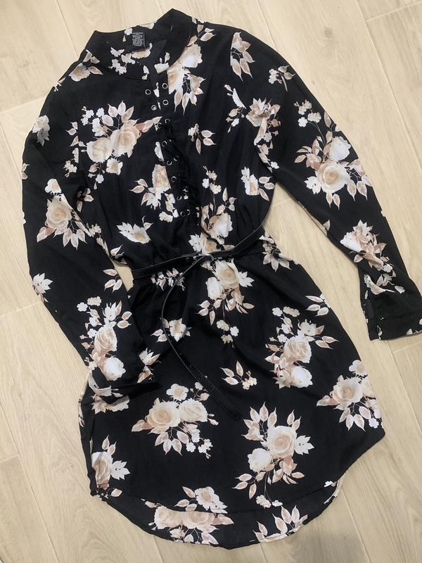 Коротенька, гарненька сукня в квітковий принт. На грудях гарно зроблено шнурочком, бока сукні з вирізами. Дуже гарно виглядає на тілі. Продаю без пояса.