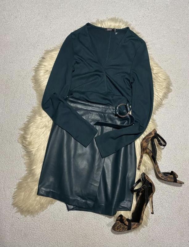 Платье изумрудно цвета низ экокожа. Длина 85 пог 40-45 пот-регулюэться поб 40-50 Модель на запах