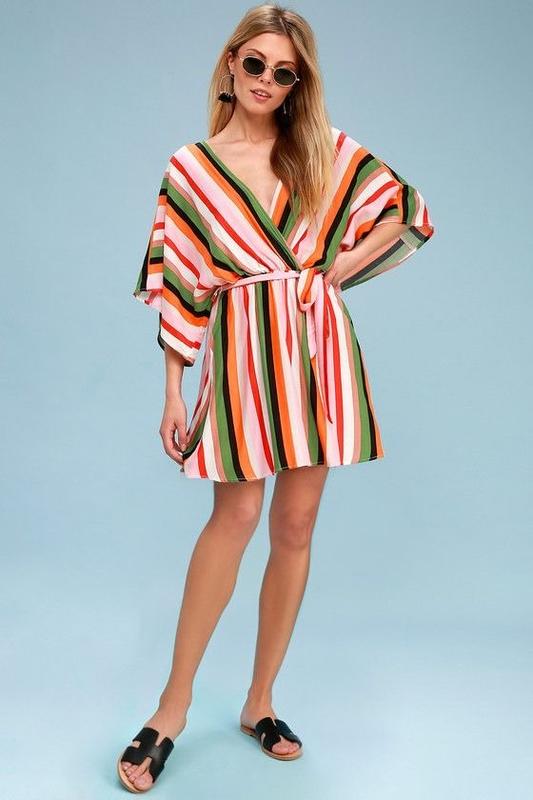 Жіноча яскрава коротка літня сукня вільного крою у смужку під пояс у розмірі М. Стан - ідеальний. Склад: 100% поліестер.