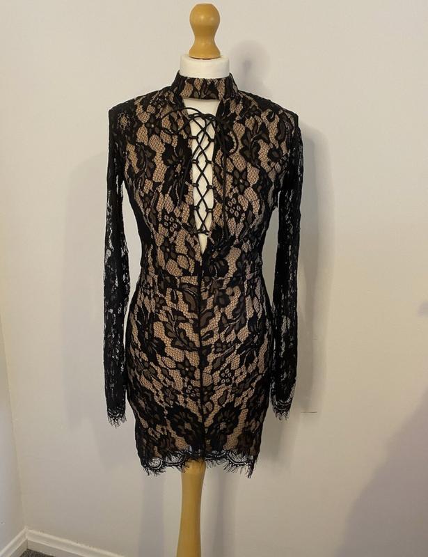 Коктейльна красива сукня із чорного мʼякого мережива на бежевій основі від бренду Ginger Fizz на бірці XS, підійде і на S Красиве декольте можна регулювати шнурівкою, спереду коротше, позаду довше Довжина виробу спереду 75 см по центру коротша Довжина позаду, 101 см Довжина рукава 62 см Обʼєм грудей 84 см+регулювання шнурівкою Талія 66 см Стегна 89 см+ тканина тягнеться