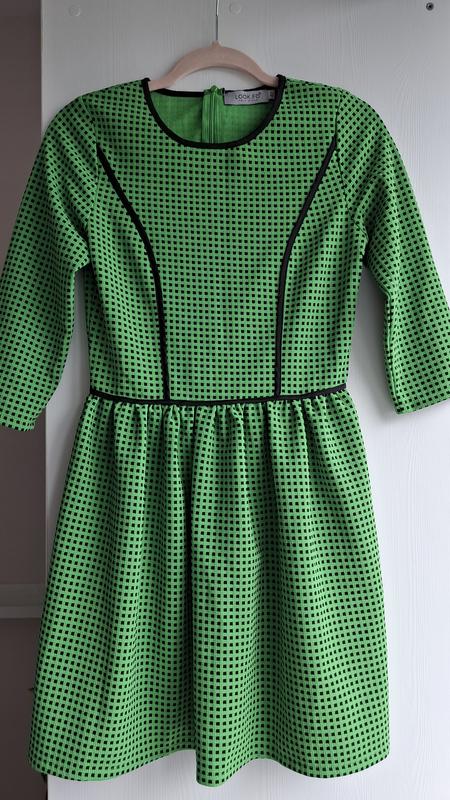 Платье зеленое в клетку, размер М, в идеальном состоянии 1 раз, длина 85 см, в талии 70 см., рукав 3/4. На этикетке указан 42 размер, но оно маломерит и реально соответствует размеру М.