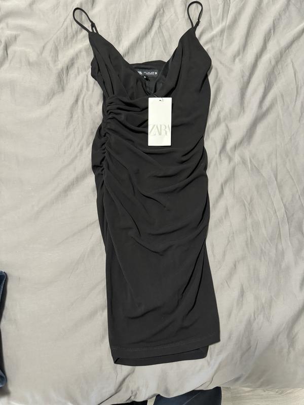Чорна жіноча сукня на бретельках від бренду ZARA. Сукня має приталений крій, з драпіруванням або збірками збоку, що створює ефектний силует. З біркою.