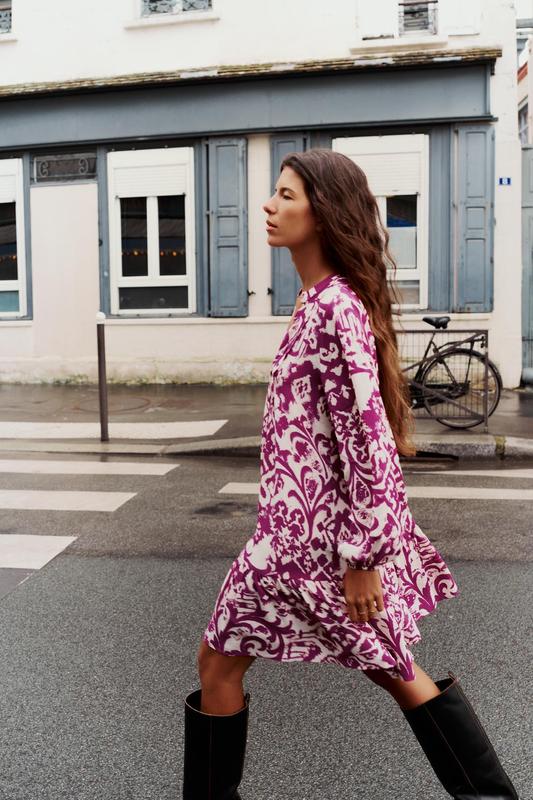 Сукня з вирізом та довгими рукавами. Еластичні кромки, збирання. Оборка знизу. Застібається на гудзики. Розмір S РОЖЕВИЙ / БІЛИЙ |9878/082/046