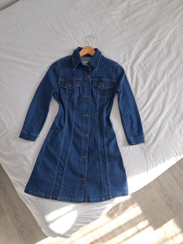 Женское джинсовое платье на пуговицах Размер - XS Замеры: Длина рукава - 48.5 см Длина по спинке – 84 см Полуобхват груди – 42 см Ширина плечей – 38 см Тканина – 92% котон 6% еластомультіестер 2% еластан