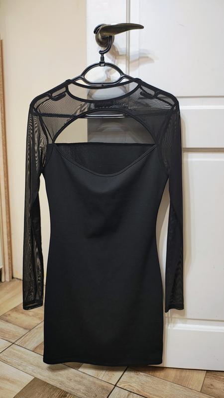 Платье-мини черного цвета, с облегающим кроем. Бренд PLT. Рукава длинные из полупрозрачной сетчатой ткани. Имеет оригинальный вырез в зоне декольте с полупрозрачной вставкой. При этом сама горловина высокая, типа полустойкая, которая удачно соединяется с той вставкой. Указан размер 10 (38), таким образом пойдет на размеры S/M. Замеры платья: ширина плечей - 41 см. НОгрудей - 42-44 см.; НОТ - 35-37 см. НОС - 42-48 см. Длина рукава от плечевого шва - 60 см. Длина платья - 80 см. Стан идеален, дефектов нет. Ткань эластичная, хорошо растягивается и плотно садится по фигуре. Платье можно носить как вечернее или коктейльное. Лучше всего подходит для клубных вечеринок, романтических свиданий или праздничных событий. Удачно сочетает в себе безупречную элегантность и сексапильность.