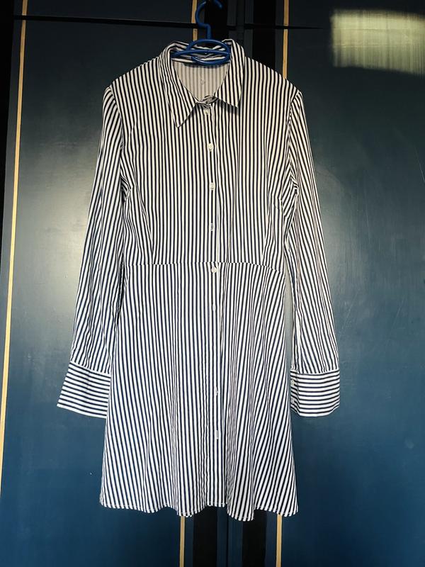 Красиве плаття сорочка, смужка додає окремого настрою, має пояс, розмір вказаний xl але мало мірить, підійде м-л Пог 53, Пот 40, довжина рукава 61 довжина сукні 88