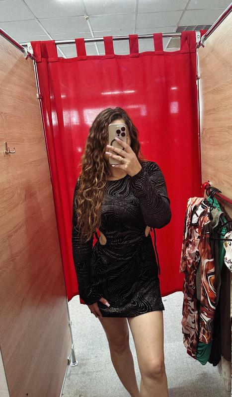 Чорна сукня міні від бренду H&M ( divided). Тканина тонкий бархат з лініями блискітками. Приталений силует з вирізками по боках, також має розрізи з боків, що дуже гарно підкреслює ніжки. Виглядає дуже стильно і святково. Розмір: L, на М також гарно сідає