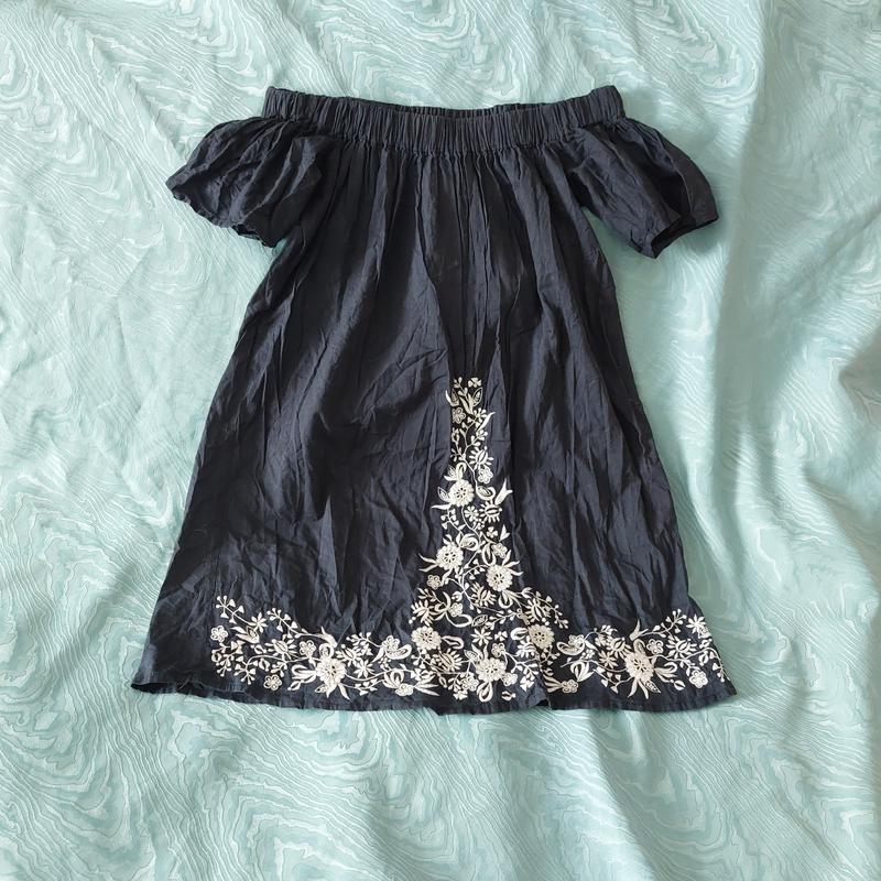 Супер платье черная с белой вышивкой, платье с приспущенными плечами, туника, s-m