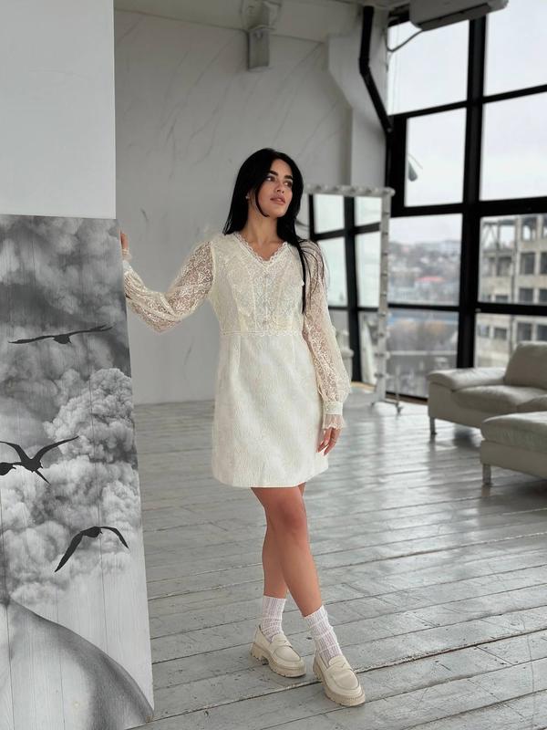 Романтична мереживна сукня з об'ємними прозорими рукавами доповнена декоративними гудзиками та текстурною спідницею❤️ Мод 2541 Розмір: м, л Тканина: мереживо/жаккард Анс