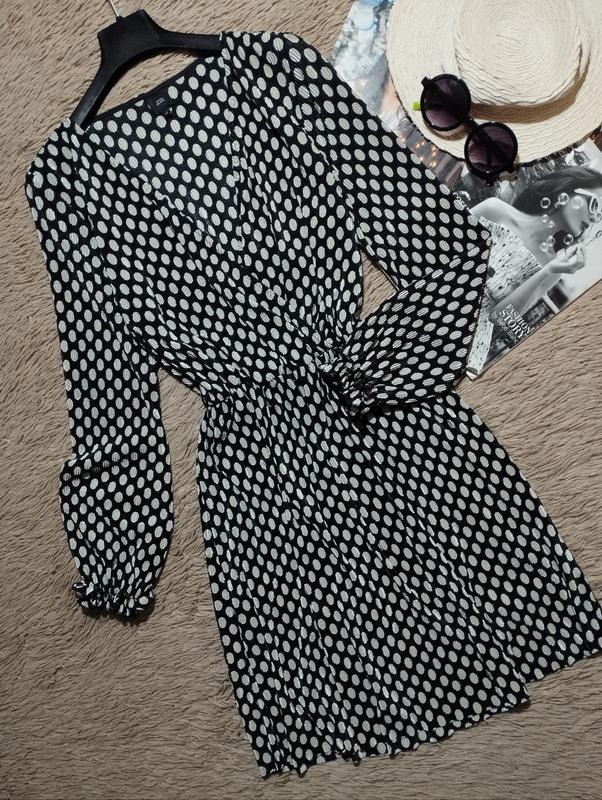 В идеальном состоянии. Шикарное платье плиссе в горошек. Тканина легка, тягнеться. Размер 12/38/M-L, но смотрите по замерам Замеры (полуобхват): Грудь 45 (тянется до 54) Талия 27 (тянется до 45) Бедра 61(тянется до 74) Рукав 57 Длина от плеча 91