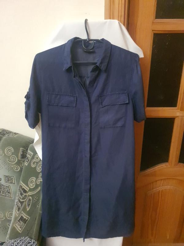 платье- рубашка темно синего цвета под джинс с карманами в швах по бокам и накладными на груди, можно надевать зимой на гольфик или футболку, 80см длина,59см в плечах и 52 см в груди