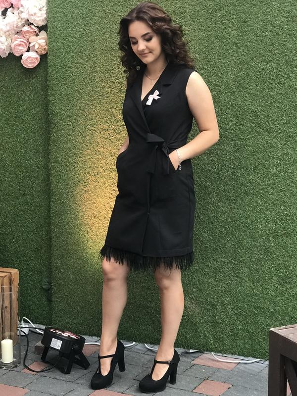 Сукня-піджак, чорного кольору, розмір S (підійде і на М), пірʼя на липучці можна зняти, також можна поєднувати з повсякденним одягом)