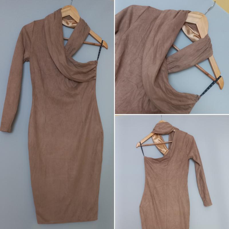 элегантное вечернее платье под замшу (ткань легкая). хомут опрокидывается через шею и застегивается впереди на кнопки. создавая утонченный образ. классно повторяет силуэт. застежка молния сбоку.