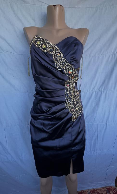 Нова сукня , темно темно синя Розмір 40(Л) але дуже маломірить ! Йде на S(44) За замірами пишіть у приватні повідомлення все скину Є на передостанньому фото плямки (потрібно випрати) бо висіла на вітрині! Оплата повна, відправка кожного дня
