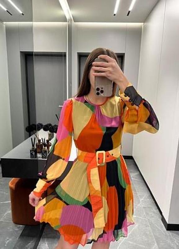 Жіноча стильна яскрава сукня з паском і плісируванням у розмірі S. Стан - ідеальний. Склад: 100% поліестер. Довжина - 80 Бюст - 40 Талія - 32 Довжина юбки від талії - 45 Довжина рукава - 60