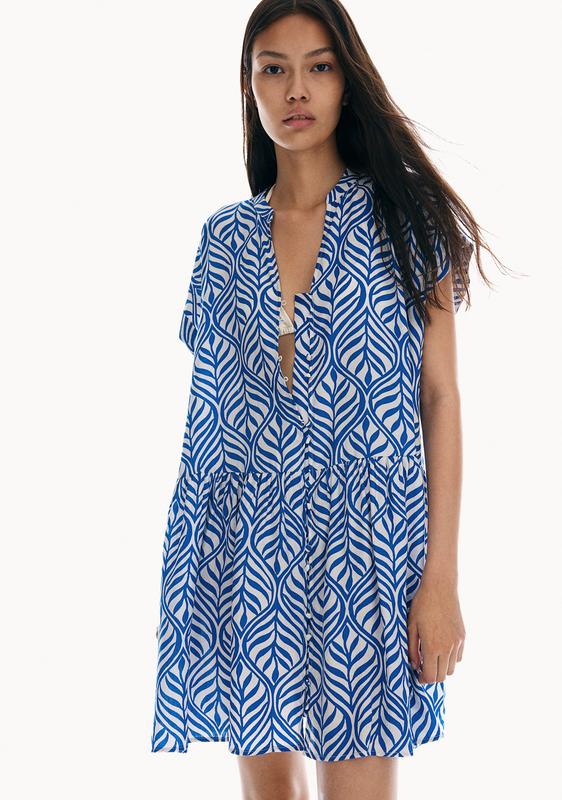 Цвет и Принт: яркий сине-белый контрастный принт, напоминающий листья или перья. Фасон: Свободный, расслабленный крой, не стесняющий движений. Длина мини. Детали: Короткие рукава-крылышки, V-образный вырез с планкой на пуговицах (застежка до незу платья, юбка с отрезной талией и легкой сборкой. Универсальность: может носиться как платье, туника или пляжная накидка/парео поверх купальника. длина 93 см пол обхват груди 63 см плечи 50 полуобхват бедер 75 см Состояние: отличный.