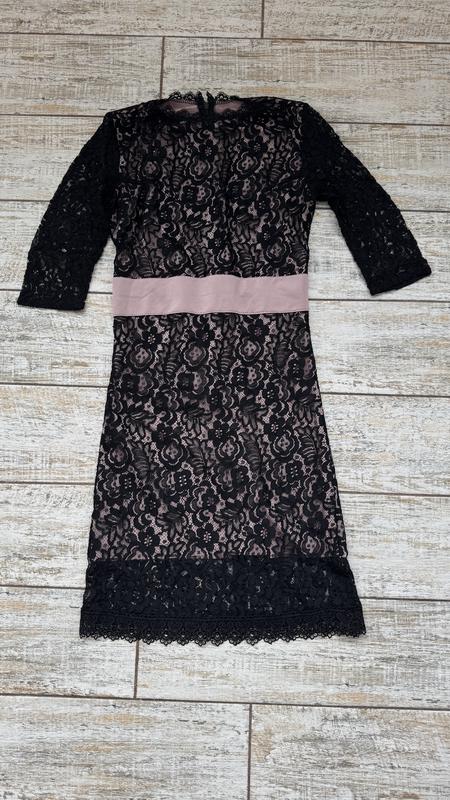 Сукня в мереживо з рожево- пудровою основою. Підійде на розмір xs. Ззаді застібається на замочок. Четвертний рукав. На поясі рожева атласна вставка, що гарно підкреслює талію.
