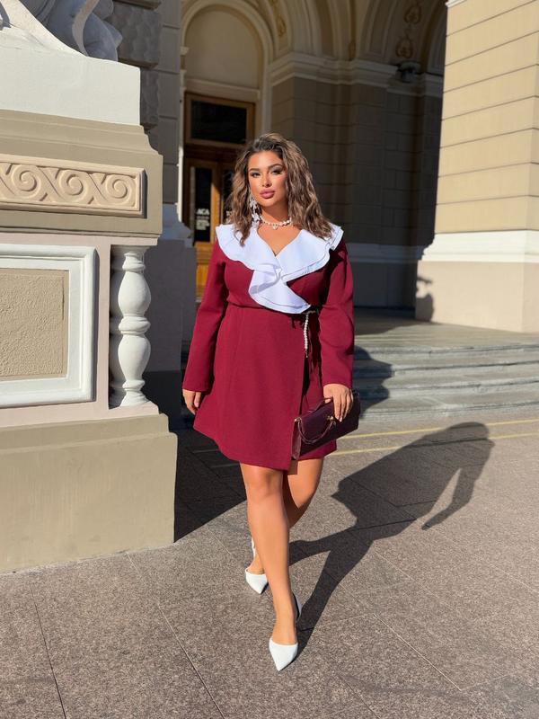 ✨Новинка✨ Элегантное платье с воротником Арт. 898 ✔️Тканина :костюмка ✔️Размеры:48;50;52;54;56 ✔️Цена:950 грн. Платье украшено воланом по линии v-образного выреза декольте. Крой на запах подчеркивает талию, визуально струнит,гармонически обыграет фигуру. На талии легкий поясок. Замеры на 898📌 ◾️48 О Г-108 ОТ-98 ОС-116 Длина рукава от плеча 60 Длина изделия 91 ◾️50 О Г-112 ОТ-102 ОС-120 Длина рукава от плеча 61 Длина изделия 91 ◾️52 О Г-116 ОТ-106 ОС-124 Длина рукава от плеча 61 Длина изделия 91 ◾️54 О Г-120 ОТ-110 ОС-128 Длина рукава от плеча 61 Длина изделия 92 ◾️56 О Г-124 ОТ-114 ОС-132 Длина рукава от плеча 61 Длина изделия 92 ✔️Сукня на запах ❗️поэтому, дает возможность,или больше стянуть передние полочки, или сделать более свободные. Поэтому, надо бы учитывать это при выборе размера. юбе