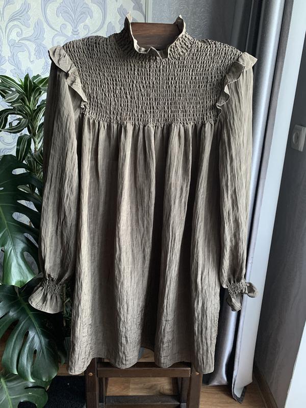 Обʼєм в грудях 106 Обʼєм в талії довільний Об’єм в стегнах довільний Рукав 65 Довжина 88 Легка та повітряна, майже, невагома сукня з довгим рукавом. На спинці застібка на блискавку. Виконана із жатої тканини красивого темно-оливкового кольору. Річ в бездоганному стані, жодних пошкоджень немає.