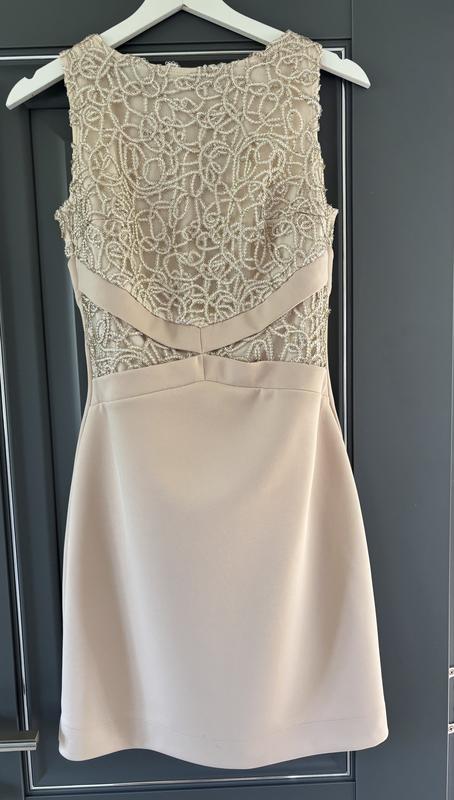 Чудово підійде на будь яку святкову подію: день народження, весілля або випускний. Або просто на вечерю в ресторан. Колір беж, розмір S. Довжина до середини стегна, відкриті плечі. Красива мереживна тканина на верхній частині сукні. Ззаду на блискавці. Пасуватиме струнким дівчатам з невеликим декольте.