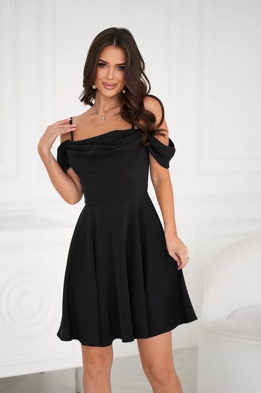 Сукня зі спущеними рукавами та драпіруванням у зоні декольте арт. emax. 7550 Розмір: S(42), M(44), L(46) Колір: чорний, молочний Тканина: костюмка Довжина: 90 см Елегантна сукня спущеними рукавами на брителях, оздоблена драпіруванням у зоні декольте, що надає образу витонченості та жіночності. Сукня ідеально підходить для особливих випадків, таких як весілля, вечірки або фотосесії.
