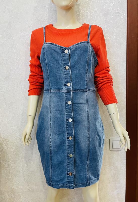 Джинсовое платье-сарафан бодикон стрейч!!! Отличный выбор для любого времени года - летом соло или на топ/футболку, осенью и зимой - на рубашки/лонгсливы/водолазки!!! Длина бретелей регулируется! Пуговицы-болты брендированы Указан размер 12, отлично тянется, подойдет на L-XL-2XL, ориентируйтесь на замеры: Длина - около 88 см Длина по боковому шву - 66 см ПОГ - 46 см (тянется до 58 см) ПОТ - 39 см (тянется до 47 см) ПОБ - 48 см (тянется до 59 см) 25-9-5