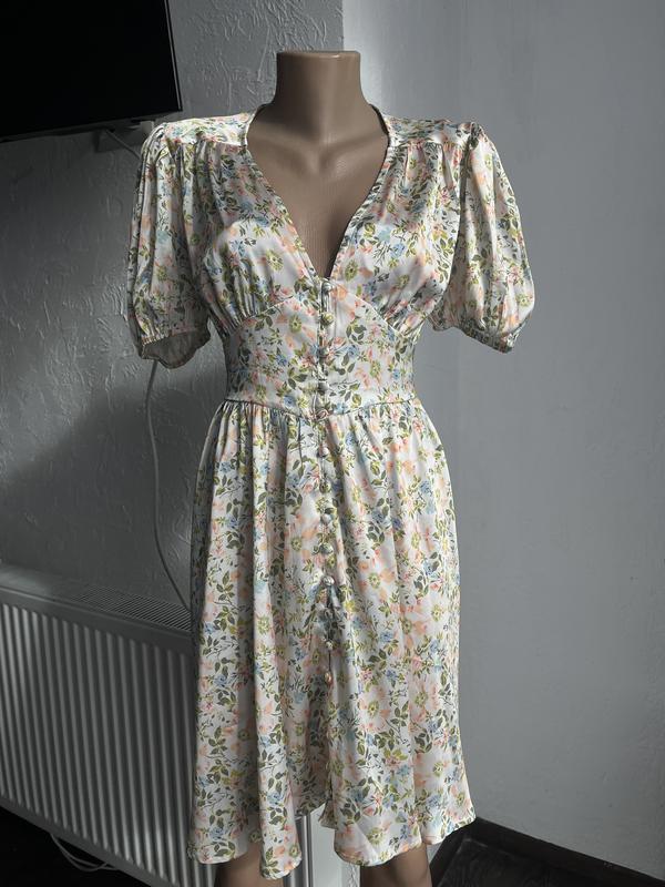 Шикарное цветочное платье. Пуговицы и акцент на талии идеально подчеркивают формы. Длина 91, полуобхват груди 46-47, полуобхват талии 36-37, бедра свободно