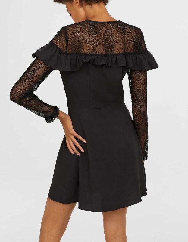 Короткое платье с треугольным вырезом с завязками на шее, а также кокеткой и длинным рукавом из кружева. Оборка сверху, переходящая на спинку платья, потайная молния сбоку, отрезная талия и широкая юбка. Размер 36-S. Бренд h&m, привезён из Англии.