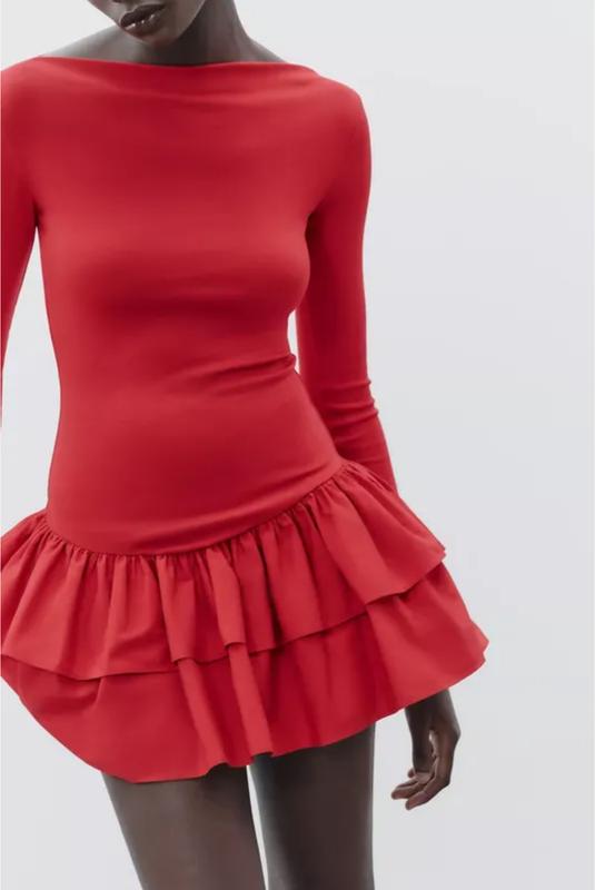 Коротка червона сукня з довгим рукавом і пишною спідницею воланами zara розмір s m l