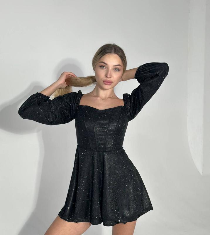 Корсетна сукня з люрексу арт. pp. 039 Розміри: 42-44, 46-48 Колір: чорний, графіт Тканина: люрекс Корсетна сукня з подвійною спідницею, на спинці йде шнуровка. Вишукана, яскрава сукня ідеально підійде для вечірнього образу.