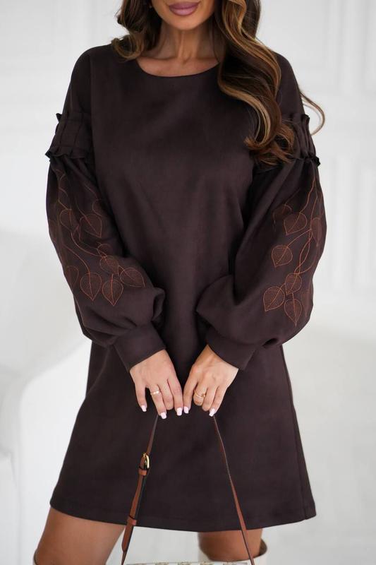Замшева сукня з вишивкою на рукавах арт. emax. 7562 Розмір: S-M(42-44), L-XL(46-48), XXL-3XL(50-52) Тканина: замш на дайвінгу + вишивка Довжина: 88 см Кольори: шоколад, черний, беж, капучино Сукня прямого крою з акцентом на об’ємних рукавах. Довжина вище коліна робить силует легким і сучасним. Рукава з делікатними складками та вишуканою вишивкою у вигляді листя створюють витончений акцент і підкреслюють індивідуальність образу. Ідеальний вибір для тих, хто цінує мінімалізм з ноткою оригінальності.