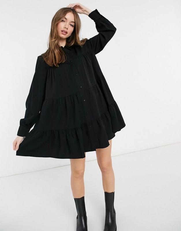 Сукня сорочка в стилі бейбідол з щільної фактурної тканини з віскозою Модель оверсайз пошита воланами, застібка на ґудзики на всю довжину Довгий рукав на манжеті, класичний сорочечний комірець Розмір ХС, але підійде і на С Нова, без паперової бірки
