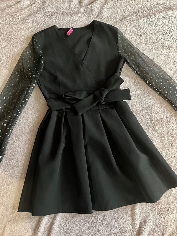 Плаття чорного кольору, дуже гарне, підійде на розмір S, з мінусів - на грудях є сліди від шпильки Заміри: ПОГ- 42см ПОТ - 34 см Дружина від плеча - 81 см Довжина рукава - 64 см