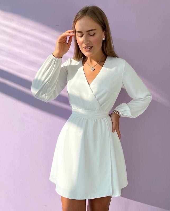 Ніжна жіноча сукня міні на запах із гарним вирізом та довгими рукавами ліхтариками