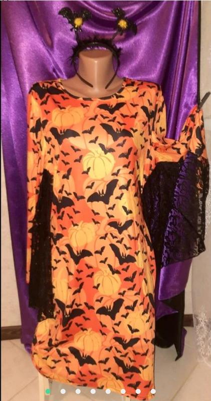 Платье или туника с принтом на тему Хэллоуина, украшено изображениями тыкв и летучих мышей. Платье с длинным рукавом и кружевными преградками под рукавом в виде крыла летучей мыши. Размер указан XL. Обхват в груди 100см, тянется еще Обхват талии 88см, тянется еще Обхват в бедрах 108см, тянется еще Длина платья 95см длина рукава 63см Комплектация: платье + головной убор обруч.
