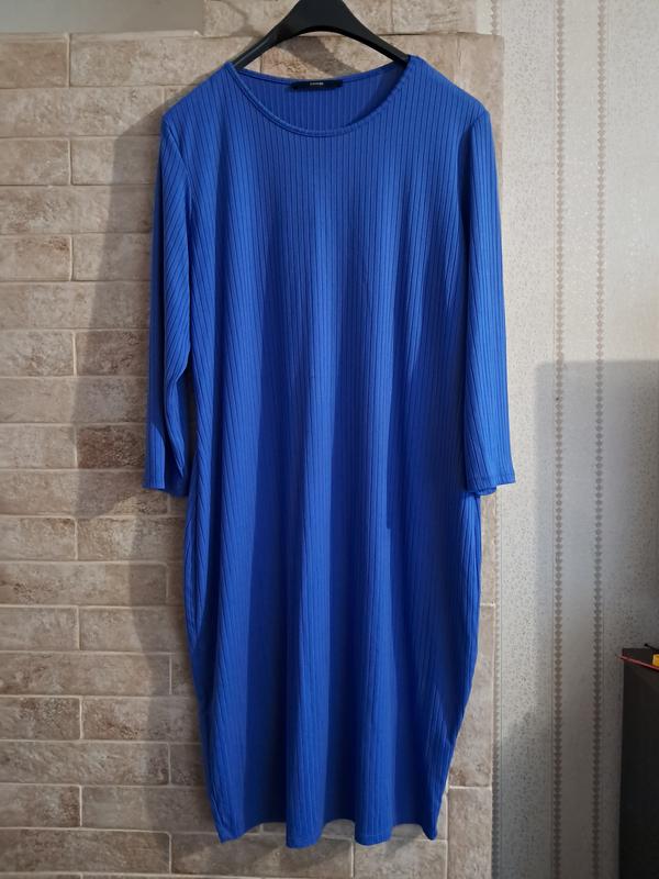 Голубое платье в рубчик, очень красивое., ложится по фигуре, но не обтягивает. Размер пишет 20, но можно 16-20