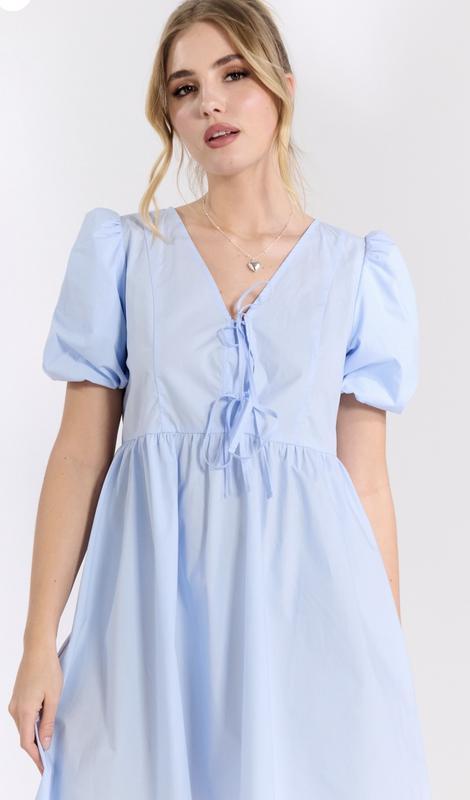 Сукня в блакитному кольорі з обʼємними рукавами та завʼязками в зоні декольте (одягалась один раз)