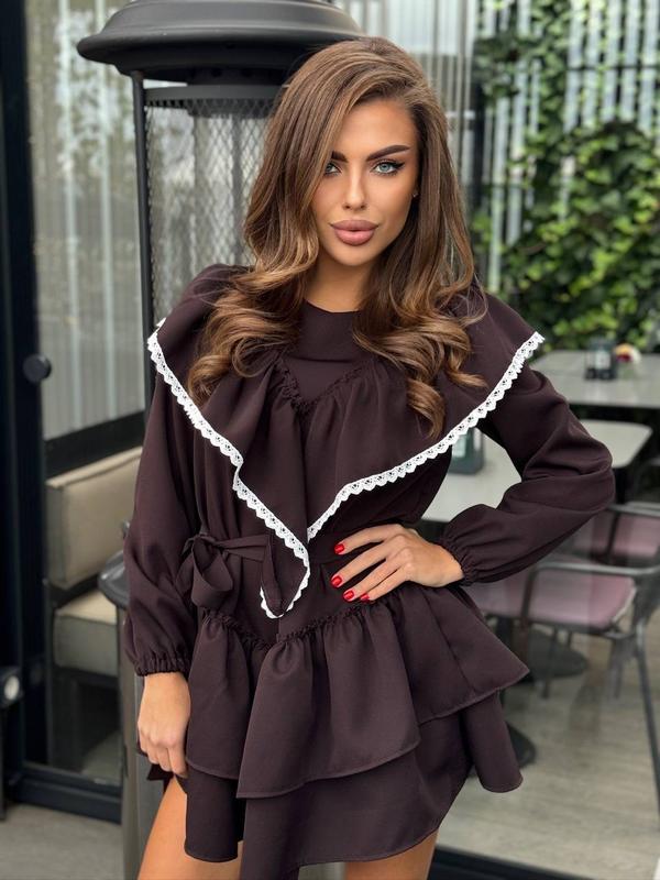 Сукня🥰 Мод: 1026-0279 Розмір: 42-46 Тканина: єврокостюмка, оздоблена білим лляним мереживом Колір: чорний, шоколад Ціна- 1059 грн🔥
