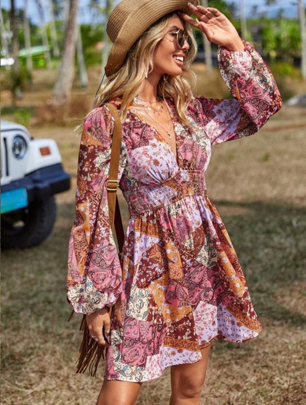Яркая мини-платье SHEIN Бохо Печворк. Платье с длинными рукавами-фонариками. Осенняя цветовая гамма: бордовый, розовый, оранжевый. V-образный вырез, акцентная сборка на талии. Новая вещь без бумажной бирки. Идеальна для фото. Размер М - L Длина 86 ПОг до 51 ПОт 37 - 51 Рукав 64 Пос свободно