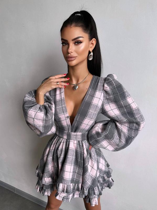 Байковое платье в клетку с объемными рукавами, байковое платье мини из декольте, короткое...