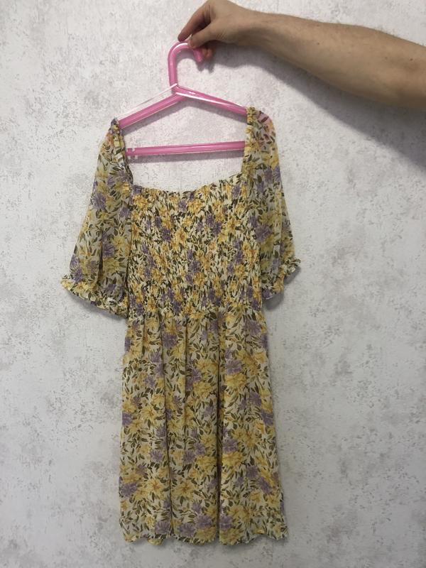 Легка квіткова сукня з жаткою та руками ліхтариками. Довжина по спині 75 см, довжина рукава 28 см, Частина грудей і талії жатка на резинці. Матеріал поліестер