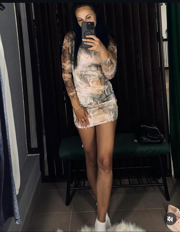 Стильное короткое платье с интересным принтом. Размер xs-s.