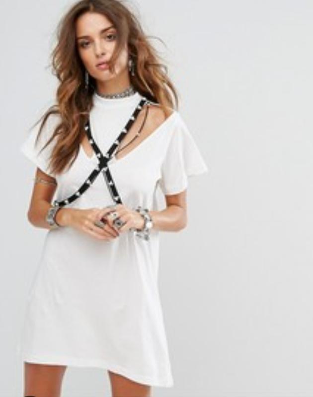Стильное платье-футболка оверсайз молочного цвета, с портупеей с ремней и жемчужинкой, с высокой горловиной и вырезами, плечи 40, ПІГ 52-56, ПИТ 52-55, ПИБ 55-58, длина изделия 84.