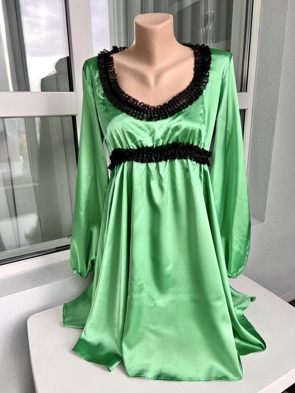 Ширина по плечах 41 см, Напівобхват грудей 50 см, Довжина рукава 61 см, Загальна довжина виробу 85 см. Під грудьми на резинці - тому обєм талії та стегон - вільно. Матеріал атлас. Шита в ательє. НЕ секонд.