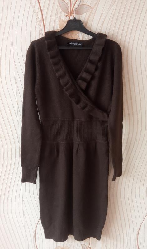 Стильное и уютное платье глубокого шоколадного цвета в очень хорошем состоянии в размере S. Мягкое, приятное к телу, красиво сидит на фигуре. Эффектный запах с оборкой по вырезу и широкая резинка на талии подчеркивают женственность. Идеально подойдет для осенне- зимнего сезона. Стильно смотрится с сапогами или ботильонами. Заг. длин -86см ПОГ -36 в ск. состоянии, потянется Плечи-32 НОТ- 30 Рукав-55 НОБ 38 Тканина тягнеться . Есть запах обработки. Нижняя бирка со составом отсутствует.