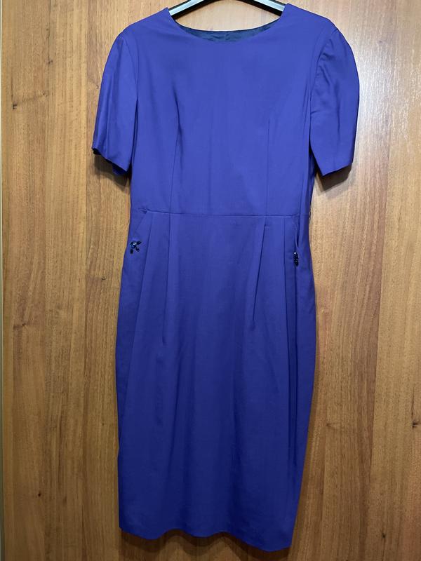 Темно-фиолетовое платье из костюмнои шерсти с элестаном, цвет передавались на фото с отделкой кармана, имеет боковой замок и вискозную подкладку. Длина 102см, плечи 40см, пог 45,5см, пот 38см, поб 50см, распорка 19см, длина рукава 24см, ширина рукава 14см
