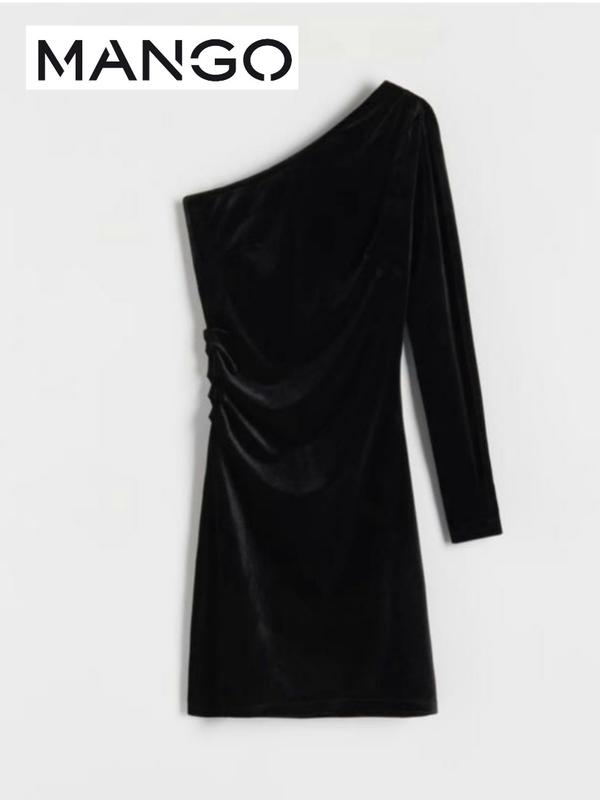 Стильное коктейльное короткое платье из мягкой бархатной ткани с одним рукавом от испанского бренда MANGO ✅ Размер EUR M / 165-88cm Цвет черный велюр 🖤 Состав: 92% полистер, 8%эластан, ткань трикотажный велюр, мягкая, очень приятная, эластичная. ✅ Новый стоочный товар без паперевой этикетки! Платье из бархатистой ткани с одним рукавом Подплечник, длинный рукав. С одной стороны на талии сборка для мягкой драпировки. Трикотажная мягкая подкладка. Прямой слегка приталенный крой. Замеры: Длина: 94см Длина рукава: 61см, плечо 10.5см Ширина под рукавами 42-44см Талія 36-40см Бедра 45-50см Трикотажная ткань, красиво тянется