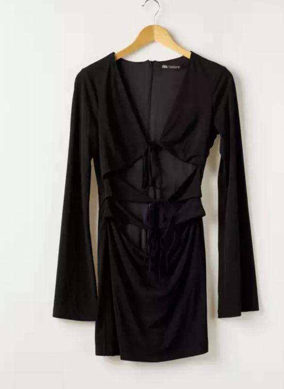 Дуже гарна плаття, чорного кольору, Розмір М., на Пог- 93 Пот-72 Поб 106 Це максимальні розміри, але ви можете на розмір менше, так як вона на завʼязках спереду, коригуєте собі як хочете. Плаття сексі-пексі) Виглядає спокусливо Рукав довгий, не заміряла, але закриває повністю пальці, край рукава широкий