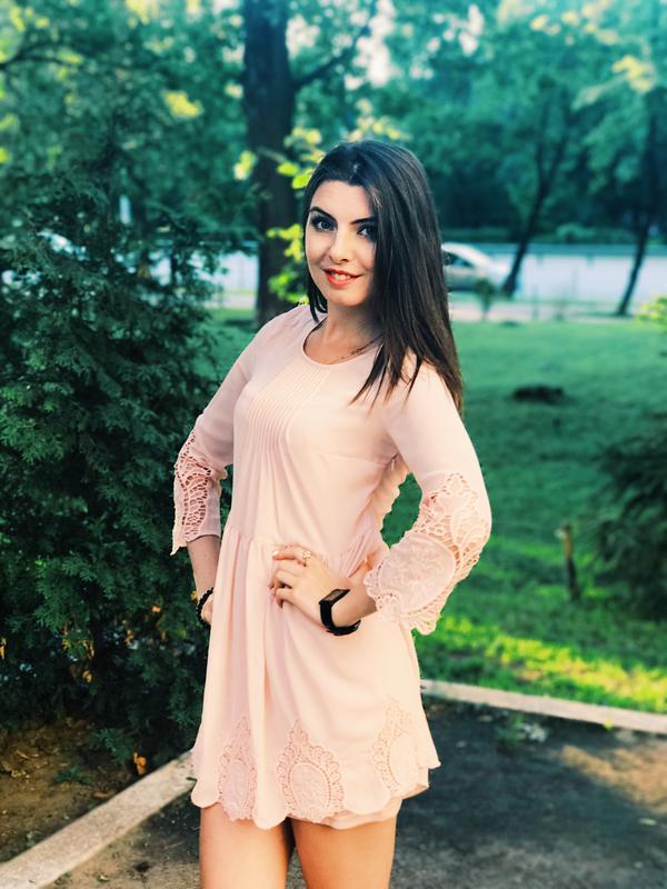 Шифоновое нежно розовое платье с кружевом. С платьем-подкладкой на тело. Длина выше колена {мой рост 170см}. Размер s.